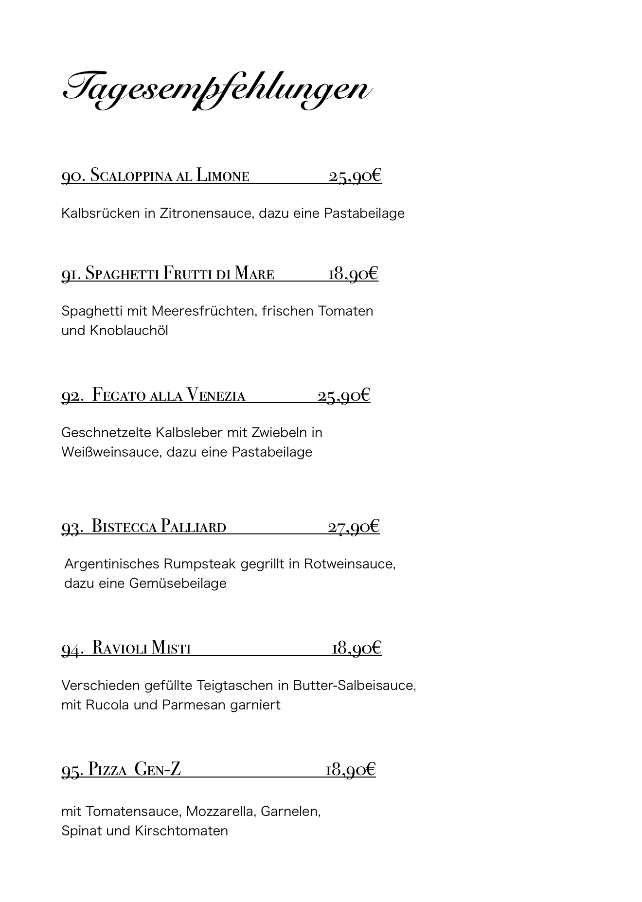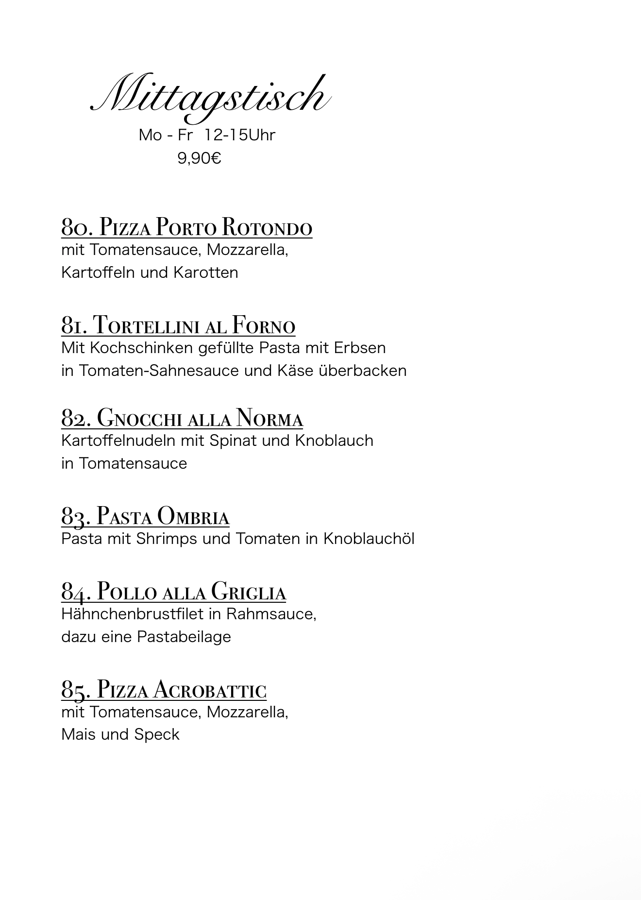 Wir bieten täglich einen frischen Mittagstisch an. Unser Mittagstisch wechselt sich alle drei Wochen. Die wechselnde Gerichte bieten wir alle für 8,90€ an. Die aktuellen Gerichte finden Sie unter dem Reiter Speisekarte.